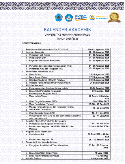 Perkuliahan Semester Ganjil Tahun Akademik 2025/2026 dimulai pada tanggal 01 September sampai dengan Desember 2025.